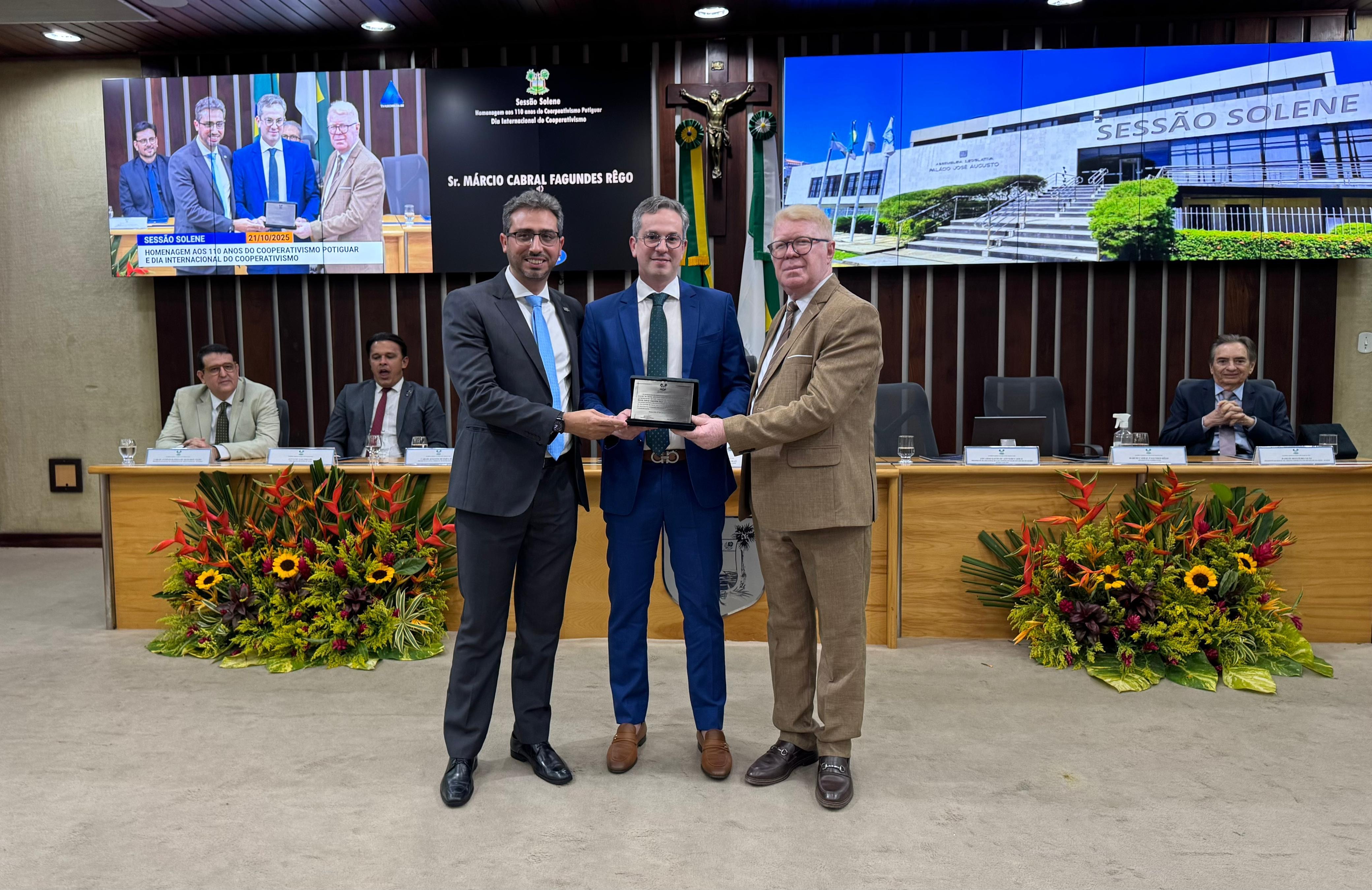 O presidente da Unimed Natal, Dr. Márcio Rêgo, foi um dos homenageados durante a Sessão Solene em comemoração aos 110 anos do Cooperativismo Potiguar e ao Ano Internacional das Cooperativas, realizada nesta terça-feira (21) na Assembleia Legislativa do Rio Grande do Norte. A solenidade foi uma proposição do deputado estadual Ubaldo Fernandes e reuniu representantes de cooperativas de diversos ramos, dirigentes do Sistema OCERN e autoridades do Estado.