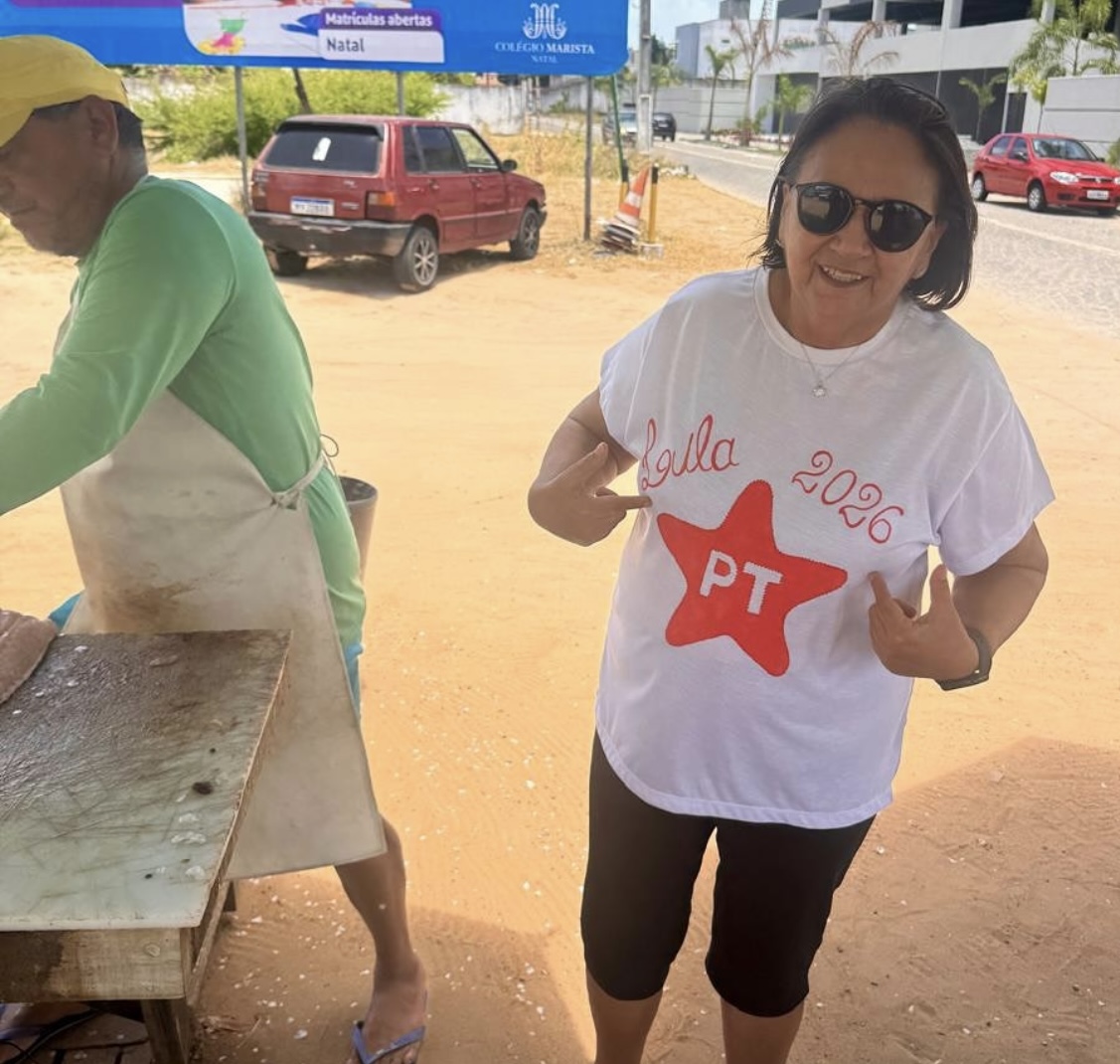 A governadora Fátima Bezerra passou este domingo (26) desfilando por Ponta Negra com uma camisa estampada com “Lula 2026”. Campanha aberta para o seu mestre e ídolo político.