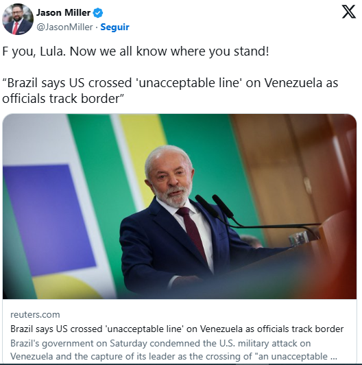 O conselheiro do presidente dos Estados Unidos, Donald Trump, Jason Miller, reagiu de forma ofensiva às críticas feitas pelo presidente Luiz Inácio Lula da Silva à ação militar americana contra a Venezuela, realizada no sábado (3/1).