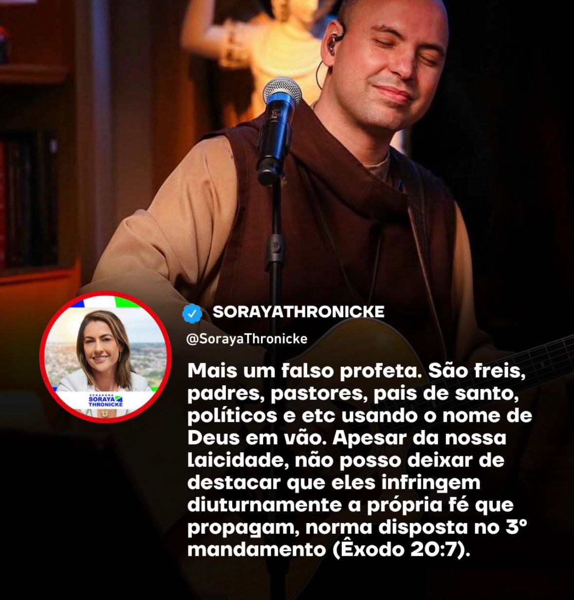 Em sua fala, Thronicke acusou líderes religiosos e também políticos de usarem o nome de Deus em vão. Ela argumentou que, apesar da laicidade do Estado, tais atitudes são uma infração à própria fé que eles dizem seguir.